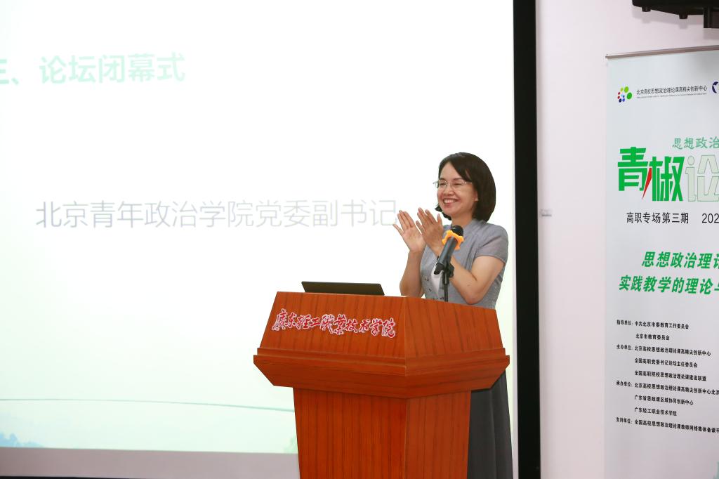 北京青年政治学院党委副书记祝文燕为论坛总结发言。她用三个关键词概括了本次论坛的特点和成果。一是自豪。她为论坛的成功举办感到自豪,为青椒论坛群英荟萃新人辈出感到自豪,为高职高专协力开展实践教学理论研究和实践探索并取得丰硕成果感到自豪!二是期待。通过八位青椒的精彩“论道”,使我们为高职高专思政课实践教学走向更高目标、取得更大成果、实现更好发展而期待,对通过更加深入研究、精准定位,突出高职特点,继续把思政课推向前进更大发展而期待!三是感谢。感谢支持本次论坛的资深专家、青年学者,感谢出席论坛和在线关注青椒论坛的各位同仁朋友,感谢北京高校思想政治理论课高精尖创新中心的领导和专家们,感谢全国高职高专党委书记论坛和全国高职高专思想政治理论课建设联盟的支持,感谢全国高职高专各兄弟院校的积极关注和热烈响应,感谢技术团队的支持,最后要特别感谢论坛的东道主广东轻工职业技术学院!