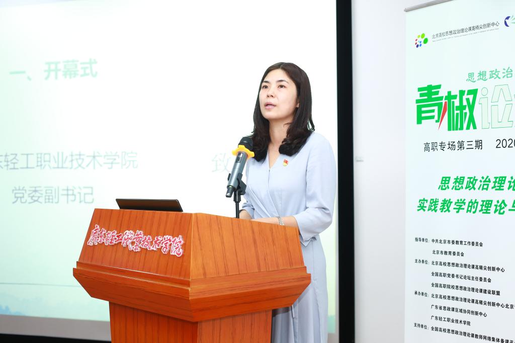 梁艳珍在开幕式上致辞,她代表承办院校向在现场和云端参加论坛的专家、青椒和老师、同学们表示感谢和欢迎。她在致辞中介绍了广东轻工职业技术学院思政课建设和实践教学开展的情况。梁艳珍指出,此次青椒论坛必将引领、启发广大思政课教师积极探索、实践,切实增强思政理论课的思想性、理论性和亲和力针对性,进一步深入推进习近平新时代中国特色社会主义思想进教材、进课堂、进头脑,必将促进高职高专院校思政课教师的互动交流,进一步深化思政课改革改革,推动思政课在线课程建设,充分利用网络平台,更好、更快地传递思政课青年教师的心声,引领高职大学生健康成长。