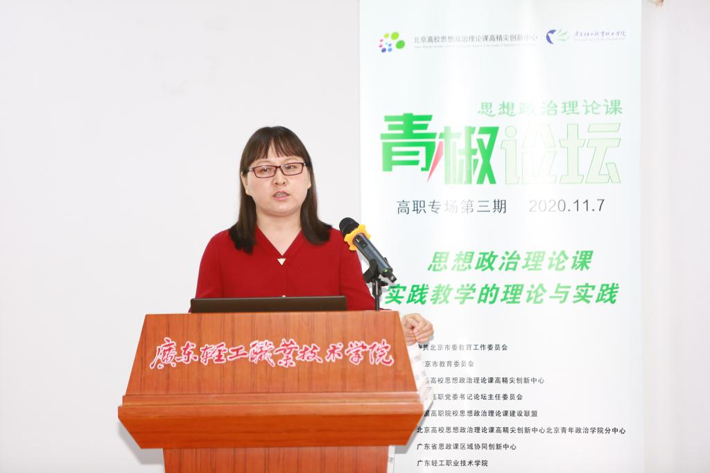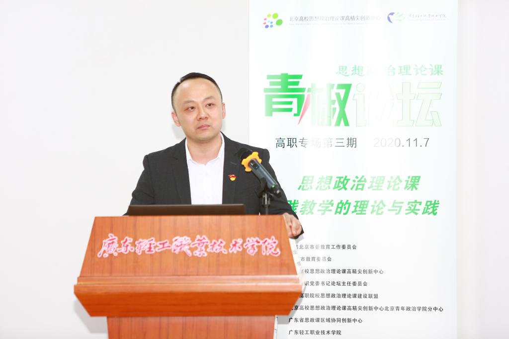 以“高职高专院校思想政治理论课实践教学的理论与实践”为主题的第三期高职高专院校思政课青椒论坛于11月7日在广东轻工职业技术学院成功举行。本次青椒论坛得到了北京市教育工委、北京市教委的指导,由北京高校思想政治理论课高精尖创新中心、全国高职高专院校思想政治理论课建设联盟、全国高职高专党委书论坛主办,北京高校思想政治理论课高精尖创新中心北京青年政治学院分中心、广东省高校思政课区域协同创新中心、广东轻工职业技术学院承办。北京高校思想政治理论课高精尖创新中心副主任、中国人民大学教授武宝瑞出席论坛并致开幕词,北京青年政治学院党委副书记祝文燕、广东工程职业技术学院党委副书记方燕、广东轻工职业技术学院党委副书记梁艳珍、北京高校思政课高精尖创新中心北京青年政治学院分中心特聘专家刘世保等领导、嘉宾出席论坛,来自广东高校区域协同创新中心各高校的教师代表现场观摩了论坛,全国各地高职高专院校思政课教师通过直播参加了论坛活动。论坛分上下午两个半场进行,分别由北京青年政治学院马克思主义学院袁宏松、广东轻工职业技术学院马克思主义学院蔡小葵主持。