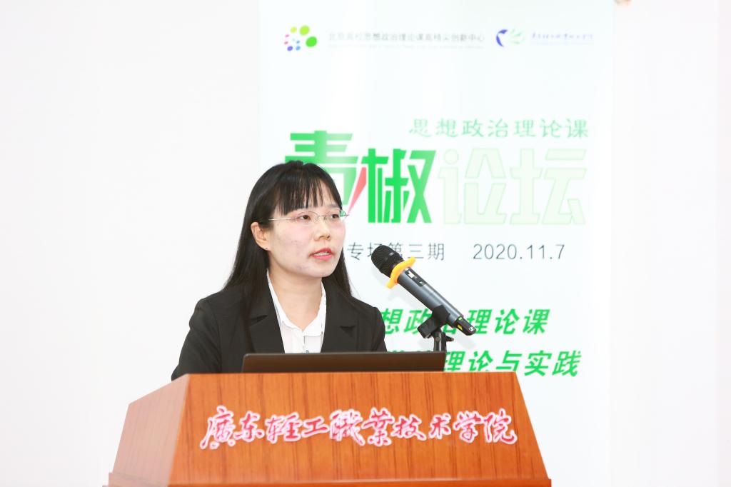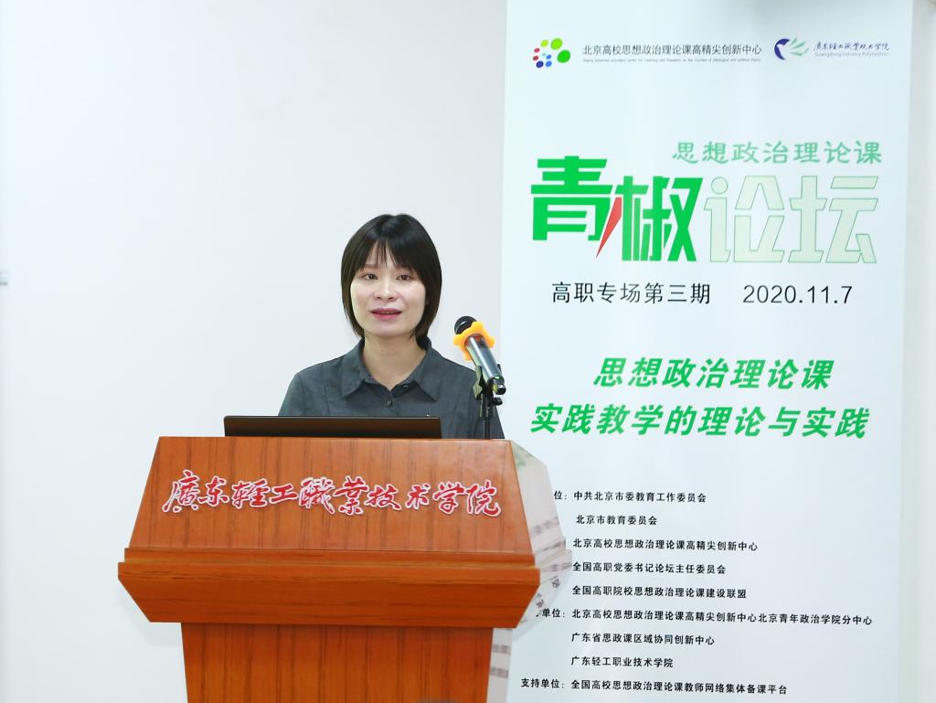 来自广东轻工职业技术学院的宋杨,广东工程职业技术学院的曾名沁,广西机电职业技术学院马克思主义学院的杨丽丽,新疆农业职业技术学院马克思主义学院李晓瞳,顺德职业技术学院马克思主义学院的林培晓,北京经济管理职业学院马克思主义学院的袁阳,重庆城市管理职业学院马克思主义学院的杨飏,广州番禺职业技术学院马克思主义学院的张秀英八位青椒分别以“研‘配方’、磨‘工艺’、新‘包装’—— 融媒体在高职思政课实践教学中的应用”、“‘做实’高职院校思政课实践教学”、 “学研修一体化实施‘青年助力脱贫攻坚’主题教育”、“‘体验、协同、多维’——实践教学的探索与思考”、“如何在实践中提升高职学生的法治思维水平”、“基于《概论》课理论体系构建的高职实践教学模式研究”、“高职思政课‘线上’驱动‘线下’联动的实践教学体系的探索与构建”、“依托大学生社团的思政课实践教学探索”为题,就高职思政课实践教学的理论思考和实践探索进行了分享。