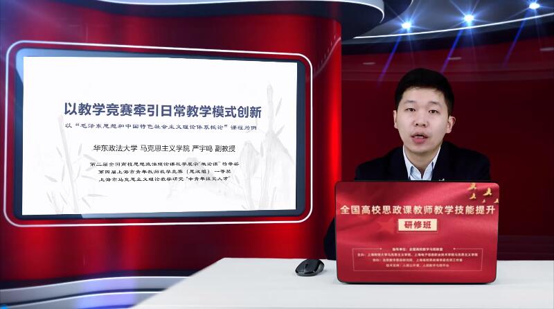 华东政法大学马克思主义学院严宇鸣副教授《以教学竞赛牵引日常教学模式创新》为题,介绍了以教学竞赛牵引日常教学模式创新。严教授重点讲授了做好“学情分析”是实现有效课程设计、课堂教学的前提条件;熟悉教材并实现对于教材表述的课堂教学话语转变是提升教学质量的核心要务;讲课技巧是提升课程教学效果的形式助力三方面。