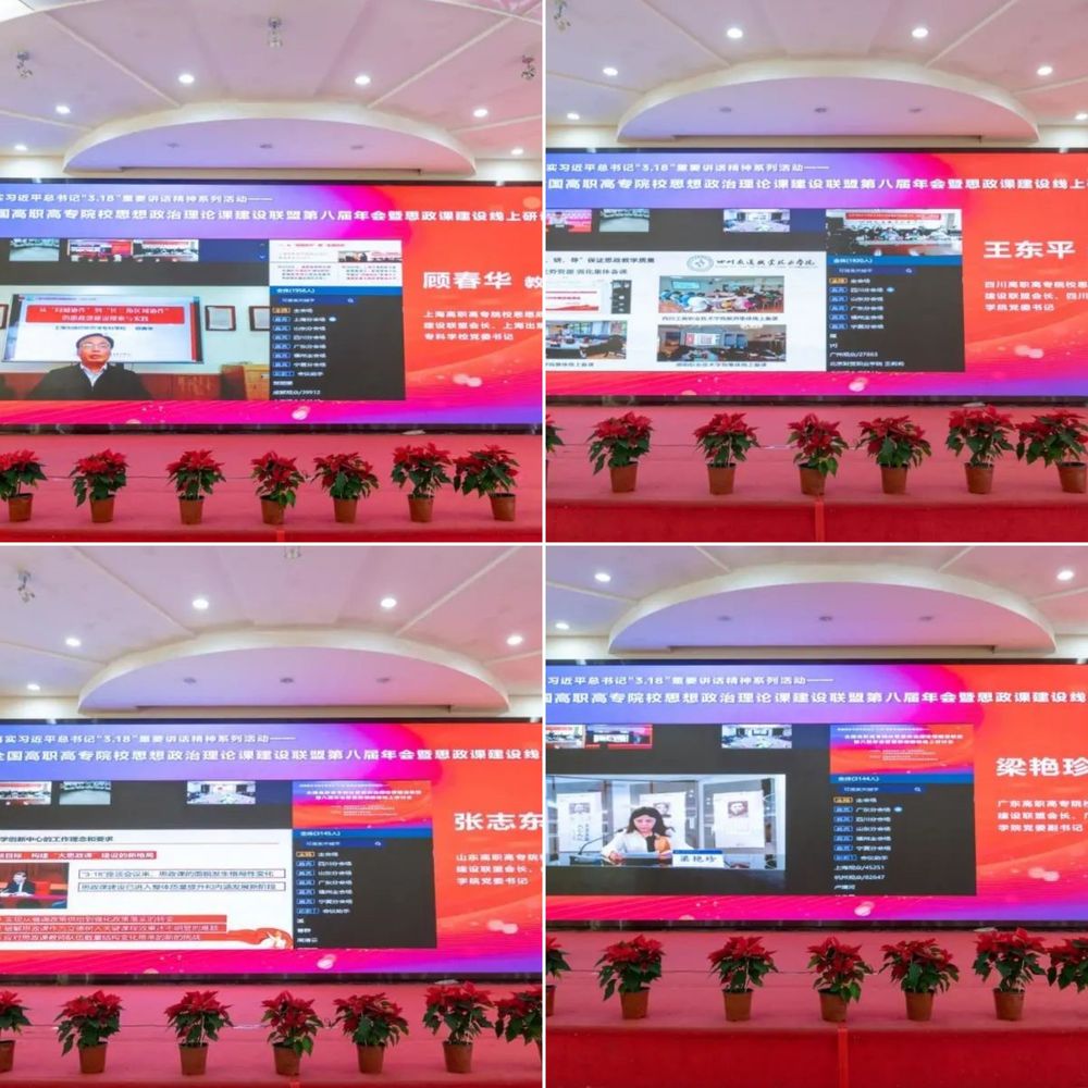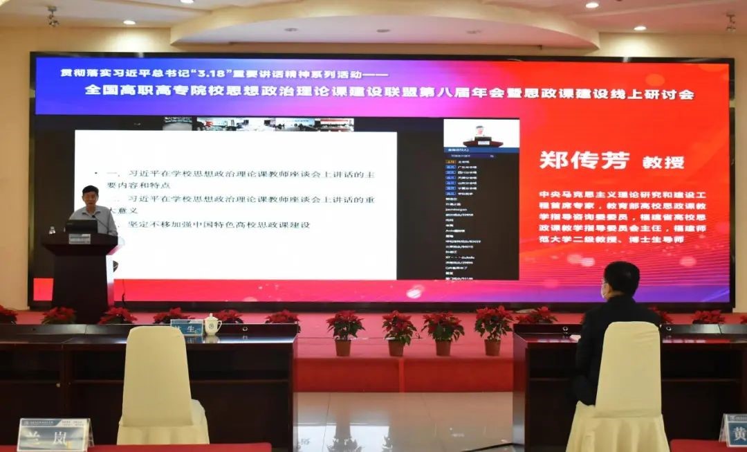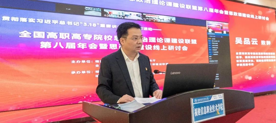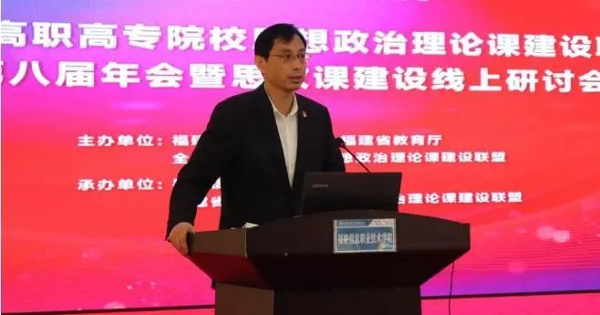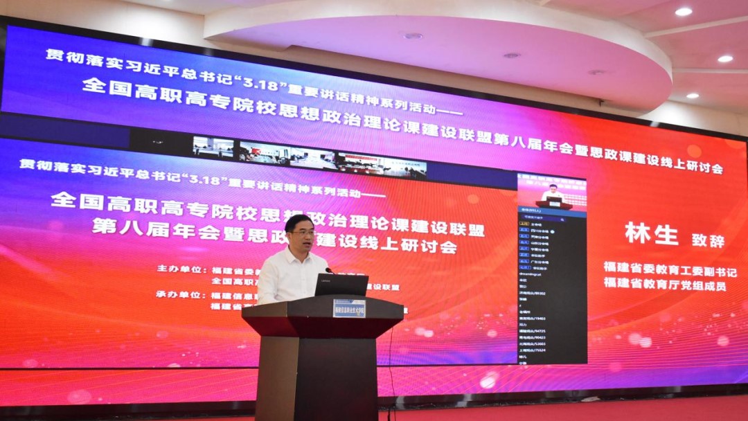 3月18日,正值习近平总书记主持召开学校思想政治理论课教师座谈会并发表重要讲话三周年,全国高职高专院校思想政治理论课建设联盟2021年工作年会暨思政课建设线上会议在福建福州召开。本次会议被福建省委教育工委、福建省教育厅列为贯彻落实习近平总书记在学校思想政治理论课教师座谈会上的重要讲话精神系列教研活动暨2022年“讲好中国故事 上好思政课程”创优攻坚行动的系列活动之一,由福建省委教育工委、福建省教育厅和全国高职高专院校思想政治理论课建设联盟共同主办。受福建省委教育工委书记、省教育厅党组书记、厅长林和平委托,福建省委教育工委副书记、省教育厅党组成员林生出席会议并致辞,全国高职高专院校思想政治理论课建设联盟会长、广东轻工职业技术学院党委书记杜安国在线出席会议。会议主会场设在福建信息职业技术学院,联盟理事会各成员单位设分会场。来自全国高职高专院校思想政治理论课建设联盟的主要领导、全国高职高专院校马克思主义学院院长(思政部主任)和思政课骨干教师4.3万人次参加了本次会议。