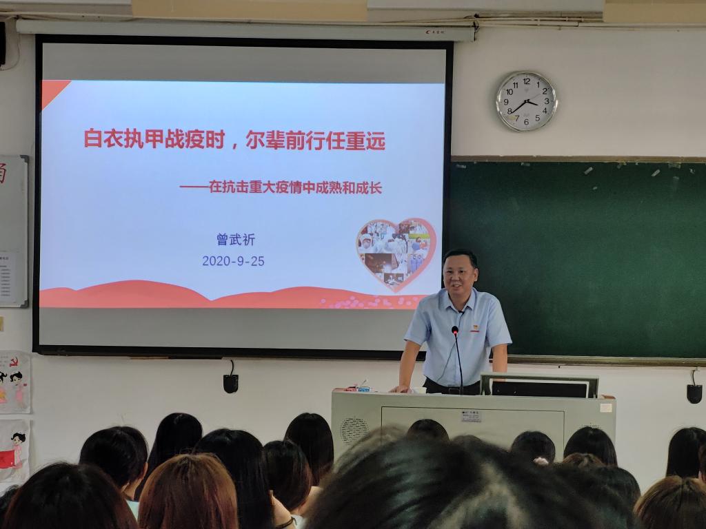 9月开学伊始,福建卫生职业技术学院党委书记曾武祈、党委副书记李美华、纪委书记游锋、副院长陈贞健、副院长黄铭珊等校领导,以“白衣执甲战疫时,尔辈前行任重远”、“战‘疫',我们在一起!”为主题纷纷走上讲台,以学生喜闻乐见、想听爱听的内容以及风趣幽默、感人肺腑的语言,为在校大学生上了一堂既生动活泼又充满正能量的开学第一课,用抗疫精神滋养心灵,用英雄丰碑感召时代,在卫院学子心中点亮一盏明灯,照亮征途、指引方向。