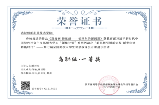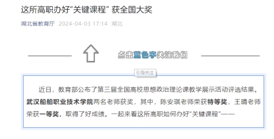 近日,教育部公布了第三届全国高校思想政治理论课教学展示活动评选结果。武汉船舶职业技术学院陈安琪老师荣获特等奖,王晴老师荣获一等奖,取得了本届思政课教学展示比赛全国高职高专院校最好成绩,同时实现了湖北省高职高专院校在该项大赛上特等奖“零”的突破。这是该校深入贯彻落实习近平总书记关于思政课建设的重要指示批示精神,打造素质优良的新时代思政课教师队伍,深化思政课改革创新的一大成果。