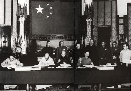 1951年5月23日西藏地方政府全权代表阿沛·阿旺晋美、邮购墨·索安旺堆、土丹旦达、土登列门和桑颇·登增顿珠和中央人民政府全权代表李维汉、张经武、张国华、孙志远在北京签订《关于和平解放西藏办法的协议》。朱德副主席、李济深副主席、陈云总理出席签字仪式。