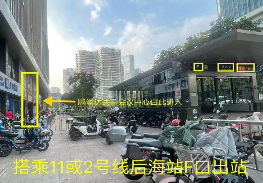 2.深圳北站:乘坐地铁4号线深圳北站(坐5站)到地铁少年宫站转乘地铁3号线(坐1站)到地铁福田,再转乘11号线到地铁后海站F出口。步行约20米到鹏润达商业广场东座乘电梯抵达11楼夫子国际会议中心