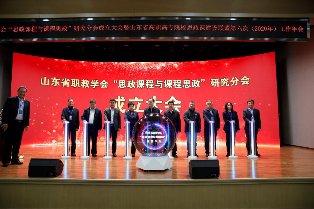 随后,山东省职教学会“思政课程与课程思政”研究分会成立启动仪式举行,冯继康、赵爱华等10位领导共同开启启动球。