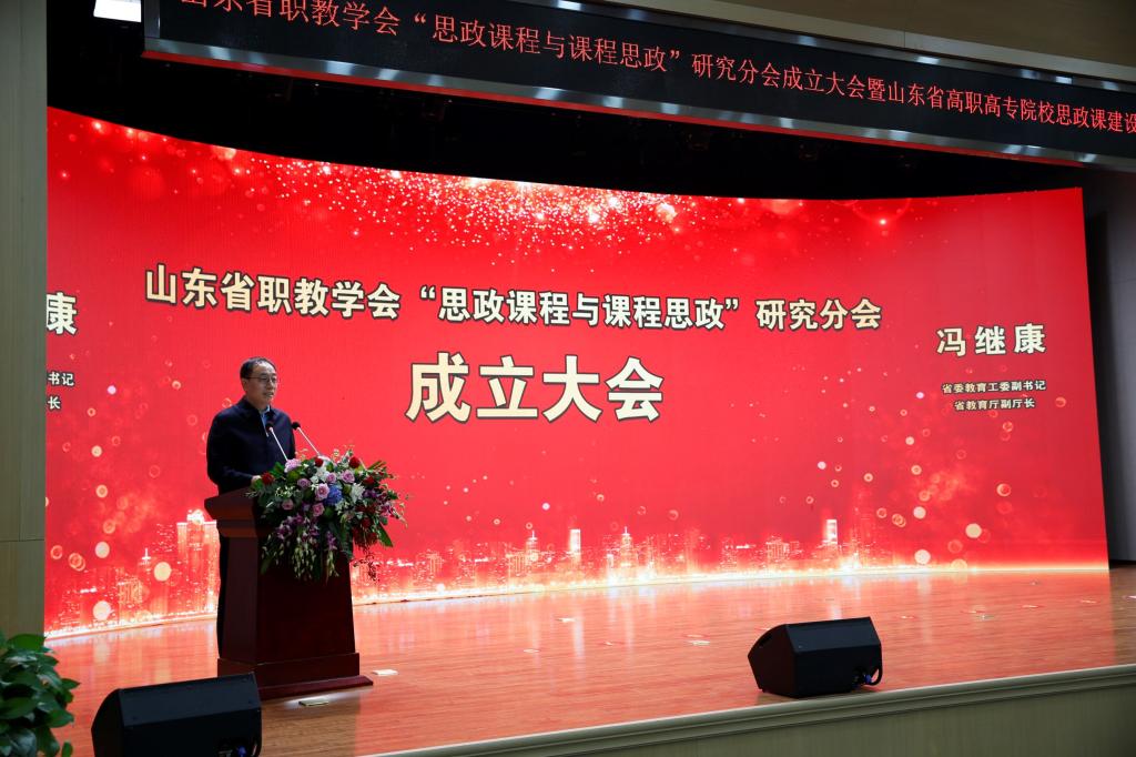 山东省委教育工委副书记、省教育厅副厅长冯继康讲话。他表示此次“思政课程与课程思政”研究分会的成立意义重大,并充分肯定了山东省职业技术教育学会对于全省职业技术教育发展的重要作用、山东省联盟对于全省高职高专院校思政课教育工作提升的重要作用。他指出,做好思政课程与课程思政建设,首先要准确把握二者的辩证关系,要以习近平总书记关于课程思政与思政课程的重要论述为根本遵循。思政课程与课程思政角色迥异,方式有别,但最终目标一致,要充分认识到思政课程是主动脉,课程思政是微循环,二者相辅相成。要畅通主动脉,激活微循环,真正使思政课程与课程思政同向同行,形成良好的协同效应。二是要加快思政政治课改革创新,要不遗余力贯彻落实好全国思政课教师座谈会精神,推进改革创新,不断提高思政课的思想性、理论性和亲和力。三是稳步推进课程思政工作,实施课程思政是全员育人、全程育人、全方位育人的必然要求,其基础在于课程,重点在于思政,关键在于教师。要重点优化课程思政内容,紧盯国家、省市、县域发展需要,构建全面覆盖、类型丰富、层次递进、相互支撑的课程思政体系,达到润物细无声的课程效果。“思政课程与课程思政”研究分会要加强自身建设,规范职能机制,充分发挥桥梁作用,广泛联系各级各类职业院校的专家学者,研究工作新形势、新特点、新思路,推动职业院校思政政治工作迈上新台阶。