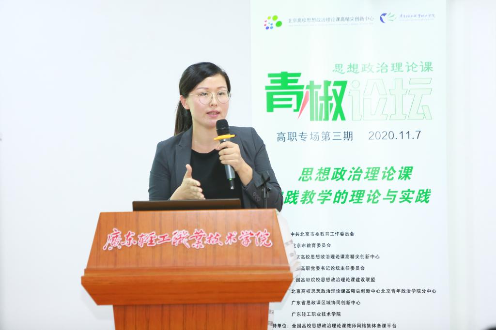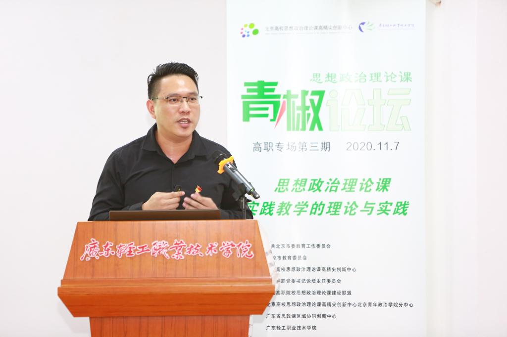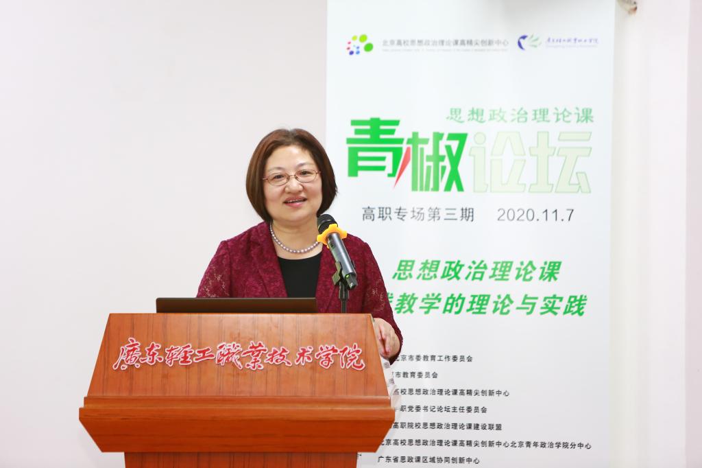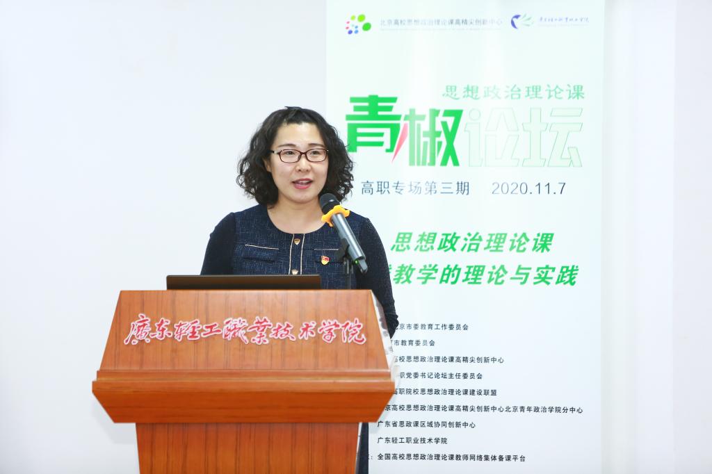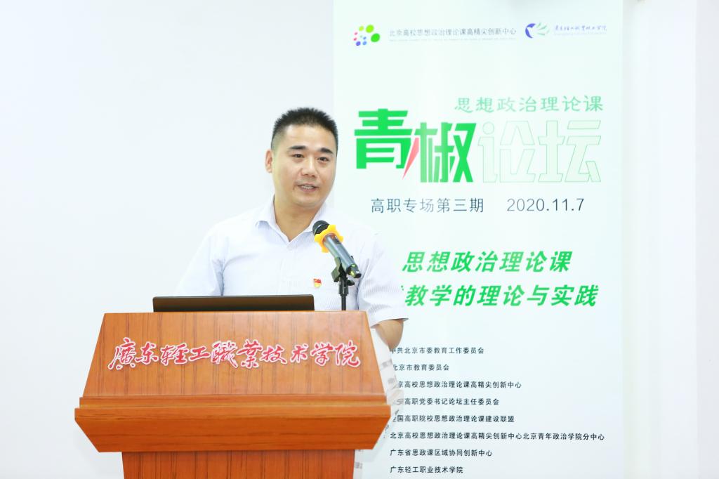 以“高职高专院校思想政治理论课实践教学的理论与实践”为主题的第三期高职高专院校思政课青椒论坛于11月7日在广东轻工职业技术学院成功举行。本次青椒论坛得到了北京市教育工委、北京市教委的指导,由北京高校思想政治理论课高精尖创新中心、全国高职高专院校思想政治理论课建设联盟、全国高职高专党委书论坛主办,北京高校思想政治理论课高精尖创新中心北京青年政治学院分中心、广东省高校思政课区域协同创新中心、广东轻工职业技术学院承办。北京高校思想政治理论课高精尖创新中心副主任、中国人民大学教授武宝瑞出席论坛并致开幕词,北京青年政治学院党委副书记祝文燕、广东工程职业技术学院党委副书记方燕、广东轻工职业技术学院党委副书记梁艳珍、北京高校思政课高精尖创新中心北京青年政治学院分中心特聘专家刘世保等领导、嘉宾出席论坛,来自广东高校区域协同创新中心各高校的教师代表现场观摩了论坛,全国各地高职高专院校思政课教师通过直播参加了论坛活动。论坛分上下午两个半场进行,分别由北京青年政治学院马克思主义学院袁宏松、广东轻工职业技术学院马克思主义学院蔡小葵主持。