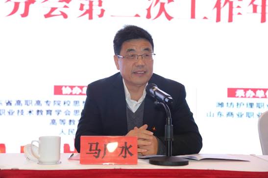 山东省职业技术教育学会会长马广水讲话,他代表学会,感谢省委教育工委、省教育厅一年来对校思想政治理论课建设联盟的大力支持和精准指导,感谢潍坊护理职业学院承办年会、萌新磨课总会所做的全力准备和辛勤付出。他指出,学会在2021年创新打造的“萌新磨课会”这一原创品牌,成效是有目共睹、有口皆碑的,会员单位有机会就想承办,已成规模、渐成品牌,2022年将扩大影响、推向全国。他强调,思政课程与课程思政“任务艰巨、使命光荣、前途光明”,课程很好教、教好不容易,不论是思政课教师还是课程思政教师,都应该深研教学、久久为功,需要经过长久的坚持、深入的钻研、不断的交流,才能成为有理想信念、有道德情操、有扎实学识、有仁爱之心的“四有”好老师。