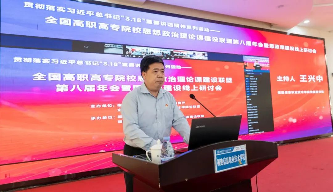 3月18日,正值习近平总书记主持召开学校思想政治理论课教师座谈会并发表重要讲话三周年,全国高职高专院校思想政治理论课建设联盟2021年工作年会暨思政课建设线上会议在福建福州召开。本次会议被福建省委教育工委、福建省教育厅列为贯彻落实习近平总书记在学校思想政治理论课教师座谈会上的重要讲话精神系列教研活动暨2022年“讲好中国故事 上好思政课程”创优攻坚行动的系列活动之一,由福建省委教育工委、福建省教育厅和全国高职高专院校思想政治理论课建设联盟共同主办。受福建省委教育工委书记、省教育厅党组书记、厅长林和平委托,福建省委教育工委副书记、省教育厅党组成员林生出席会议并致辞,全国高职高专院校思想政治理论课建设联盟会长、广东轻工职业技术学院党委书记杜安国在线出席会议。会议主会场设在福建信息职业技术学院,联盟理事会各成员单位设分会场。来自全国高职高专院校思想政治理论课建设联盟的主要领导、全国高职高专院校马克思主义学院院长(思政部主任)和思政课骨干教师4.3万人次参加了本次会议。
