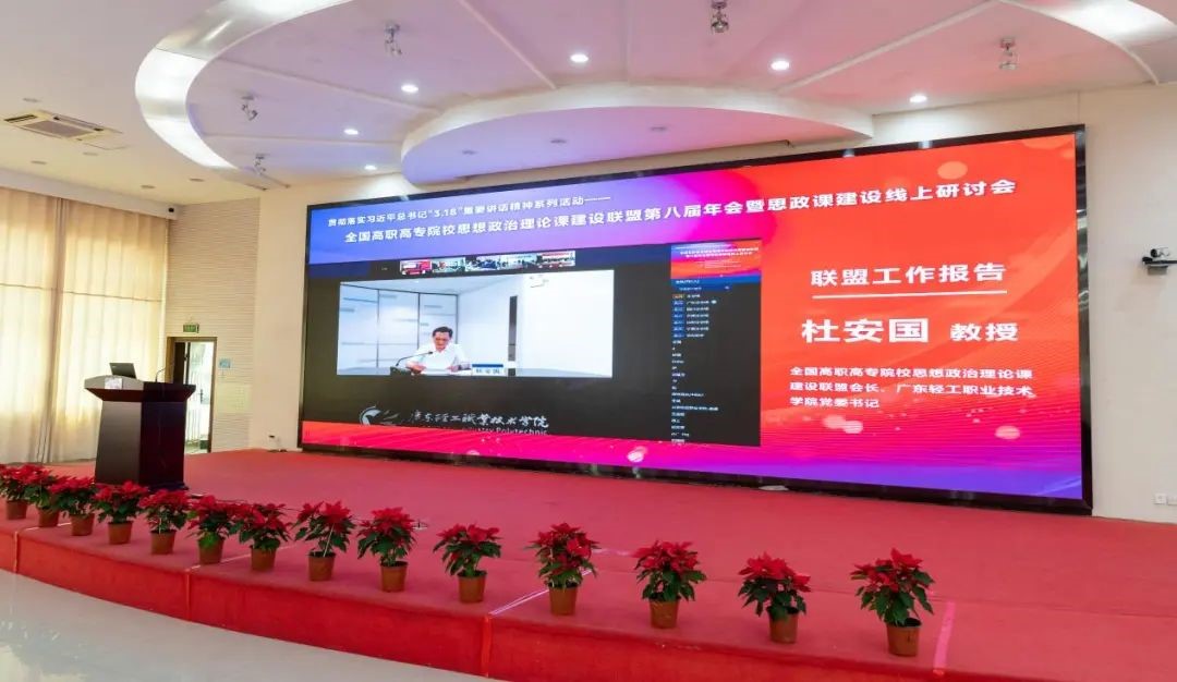 会上,全国高职高专院校思想政治理论课建设联盟会长、广东轻工党委书记杜安国作了2021年工作报告,部署了全国高职高专院校思想政治理论课建设联盟2022年工作。一年来,全国高职高专院校思政课建设联盟和各省级分联盟举办了“职业院校百名名师讲党史”“全国高校万名师生读党史”等庆祝建党100周年系列专题活动,开展了骨干教师培训、社会实践研修、调研交流等工作,组织全国高职高专院校思政课教师开展十九届六中全会精神宣讲、“手拉手”集体备课,邀请中央马克思主义理论研究与建设工程首席专家辅导2021版新教材的使用,推动高职高专院校落实立德树人根本任务,取得良好的成绩。会议前一天,教育部新闻办专门召开新闻发布会,社科司司长徐青森在发布会上介绍了三年来教育系统贯彻落实座谈会精神所采取的举措、主要进展和成效,以及下一步工作的主要考虑。杜安国在报告中传达了徐青森的讲话。