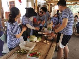学员在体验红军的一天,做红军餐、做担架救护伤员
