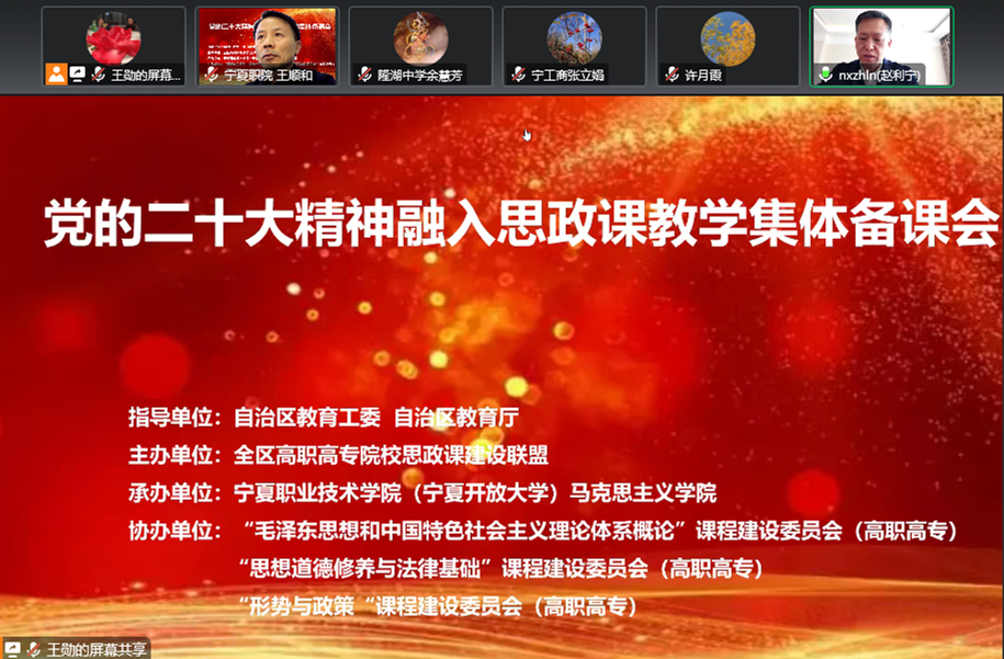 在宁夏回族自治区教育工委、教育厅指导下,宁夏高职高专院校思想政治理论课建设联盟于11月26日组织召开“党的二十大精神融入思政课教学”线上集体备课会,本次备课会由宁夏职业技术学院马克思主义学院承办。全区高职高专院校思政课建设联盟全体委员、全区高校马克思主义学院(马研部)院长(主任)和全体思政课教师、大中小学思政课教学名师工作室教学团队200多名教师参加了集体备课会。