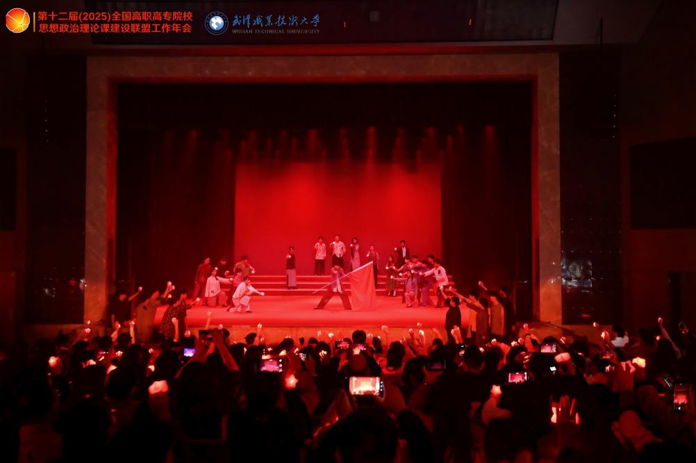 年会期间,全体参会人员还前往武汉职业技术大学德礼堂,共同参与“同上一堂大思政课”活动,由湖北艺术职业学院与武汉职业技术大学联合打造的思政舞台剧《风云武汉》精彩上演,该剧以烽火岁月为背景,通过情景再现、角色扮演、互动体验等形式,打破传统党课单向灌输模式,让观众沉浸式感受历史事件与革命精神,演出结束后,参会思政课教师仍沉浸其中,反响热烈。