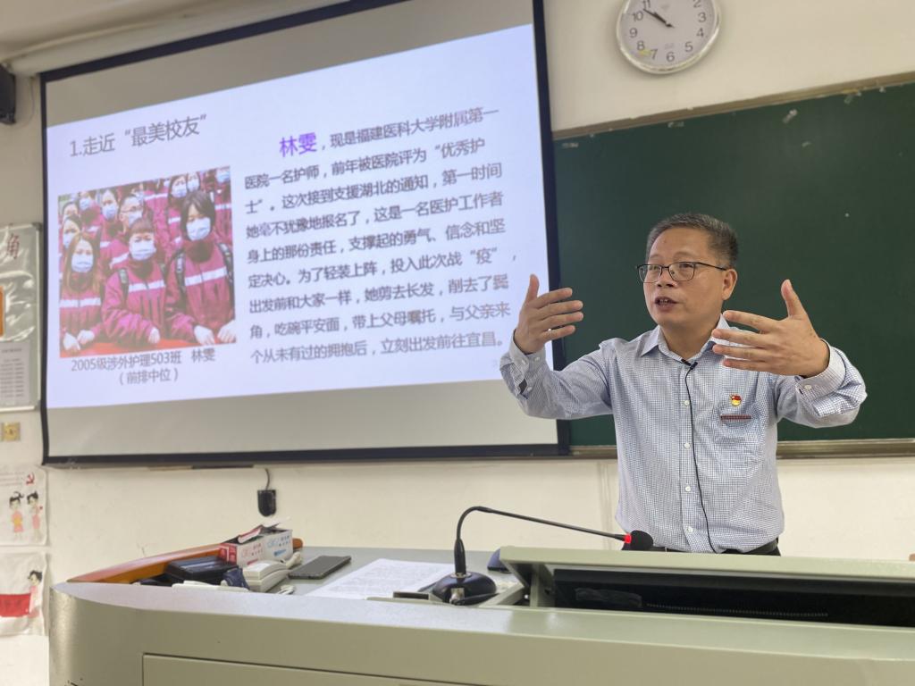 9月开学伊始,福建卫生职业技术学院党委书记曾武祈、党委副书记李美华、纪委书记游锋、副院长陈贞健、副院长黄铭珊等校领导,以“白衣执甲战疫时,尔辈前行任重远”、“战‘疫',我们在一起!”为主题纷纷走上讲台,以学生喜闻乐见、想听爱听的内容以及风趣幽默、感人肺腑的语言,为在校大学生上了一堂既生动活泼又充满正能量的开学第一课,用抗疫精神滋养心灵,用英雄丰碑感召时代,在卫院学子心中点亮一盏明灯,照亮征途、指引方向。