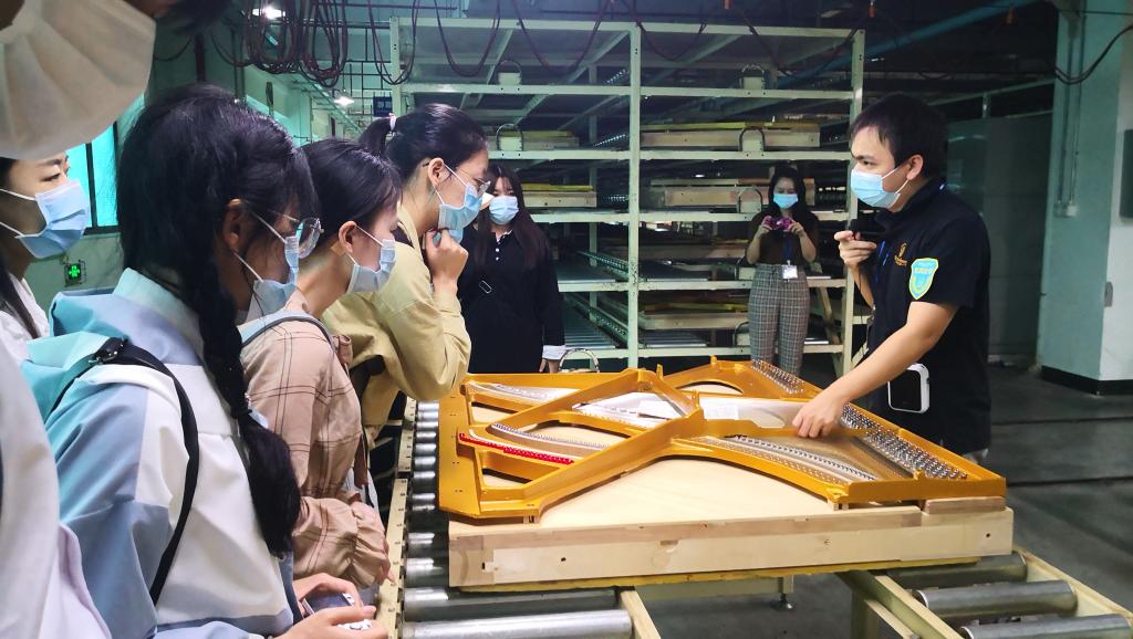 实践伊始,师生一行在该公司工作人员带领下参观各层钢琴制作车间,听工作人员讲解每一个制作步骤。了解到工人们工作有条不紊,每个步骤分工明确,同学们可通过触碰每一个零部件,每一根弦,真切感受钢琴的结构特点和发声原理。学生对此产生浓厚的兴趣,不时提问,不时拍照记录,仔细驻足观摩,低声讨论。
