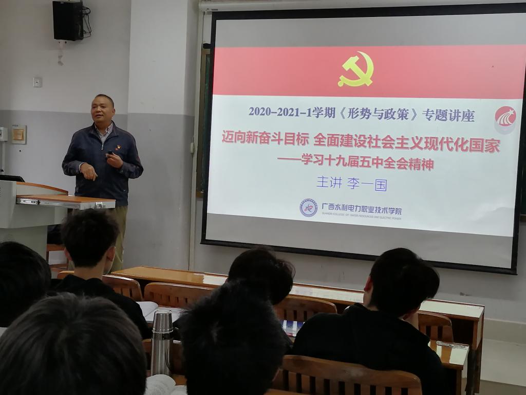 为帮助广大青年学生更好地学习贯彻党的十九届五中全会精神,2020年12月26日,由广西水利电力职业技术学院院长李林、党委副书记李一国及思政部全体专兼职教师组成的学院新时代文明实践中心宣讲团,以“迈向新奋斗目标 全面建设社会主义现代化国家——学习党的十九届五中全会精神”为题,在长堽校区和里建校区对全院2019级、2020级近13000多名学生举办专题辅导报告,深入解读十九届五中全会精神。