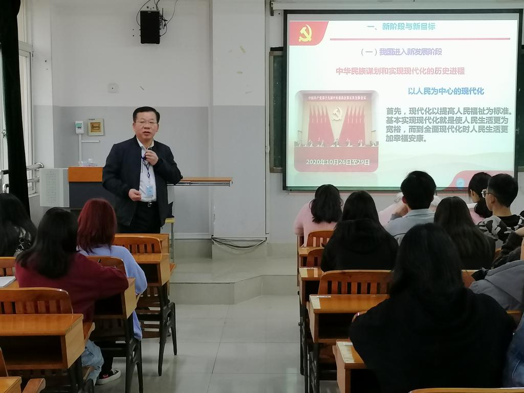 中国共产党第十九届中央委员会第五次全体会议是在即将实现第一个百年奋斗目标、开启全面建设社会主义现代化国家新征程的时刻召开的一次十分重要的会议,会议审议通过了《中共中央关于制定国民经济和社会发展第十四个五年规划和二〇三五年远景目标的建议》,对二〇三五年目标、对“十四五”时期经济社会发展作出了系统谋划和战略部署。学院新时代文明实践中心宣讲团全体教师围绕“迈向新奋斗目标 全面建设社会主义现代化国家——学习党的十九届五中全会精神”主题,从把握新发展阶段和落实新目标要求、贯彻新发展理念和落实新发展部署、适应新变化与构建新发展格局等方面在各班级中进行了全面系统的宣讲,为同学们作了一场深刻而生动的形势政策辅导讲座报告。