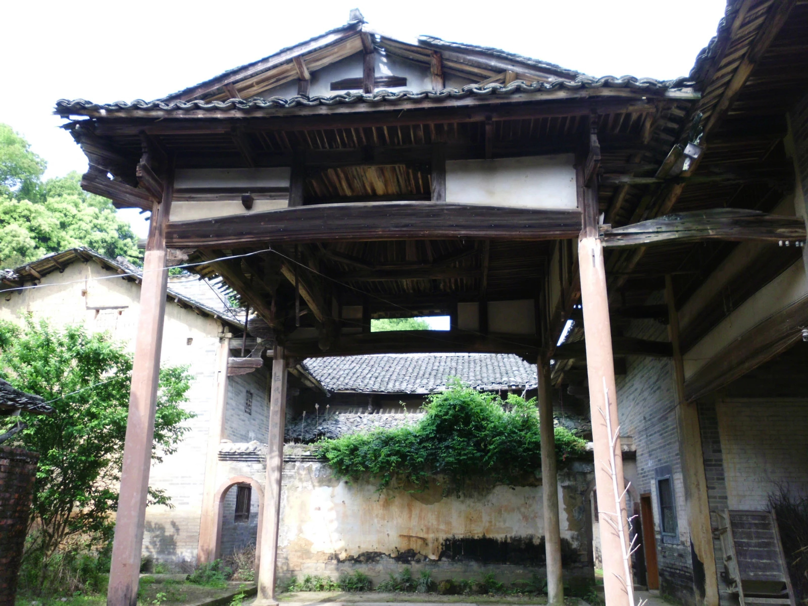 (据了解朱禄坤(朱进孙)于乾隆甲寅年(1794年)在永安溪西侧开始兴建新屋里,历经3年基本完成,老屋同族子孙分迁于此,至今有200多年。建筑正向三门并列,前后三进,主要房屋在中门。门前大院内有古井一口。进入中门,可见在一、二进之间的四柱青瓦亭,有村民说原在这里搭台唱戏。亭有藻井,彩画已磨灭,四柱上刻有诗文对联。如“矫首云霄上苑春风辉翰墨,观心山水南州佳景入楼台”、“红锦戏云紫萧吹月,南圭金玷东箭有筠"。红石质立柱两圆两方,深谙方圆之道。)