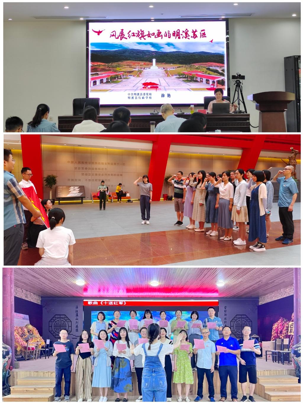 “宁化、清流、归化,路隘林深苔滑。今日向何方,直指武夷山下。山下山下,风展红旗如画。”一首毛泽东同志的《如梦令·元旦》让马院教师重回革命战争年代如火如荼的斗争场景,重温革命先烈用鲜血和生命铸就的苏区精神。在理论教学环节中,明溪县委党校高级讲师涂艳为马院教师作《风展红旗如画的明溪苏区》专题讲座。她从“路隘林深苔滑——血与火的革命实践”“风展红旗如画——谱写时代的新篇章”等两部分为教师们上了一堂生动的党史思政课。“饮水思源,决不能忘了老区苏区人民。”为铭记习近平总书记的嘱托,深化党史学习成效,马院教师前往宁化县长征出发纪念馆、明溪县革命纪念园、夏阳乡“中央红军村”御帘村、曹坊中央红军长征集结出发地、滴水岩红军战地医院旧址等历史遗迹和爱国主义教育基地开展现场教学。在教学现场,马院教师们聆听着邱门双烈士、赖水金英雄、铜铁岭战斗、战地医院等一个个感人至深的故事,铭记长征精神、苏区精神,坚定革命理想高于天,让传承红色基因、理想信念之光照亮铸魂育人之路。在长征出发纪念馆,全体思政课党员教师重温入党誓词,点燃了思政人干事创业、讲好中国故事的激情。