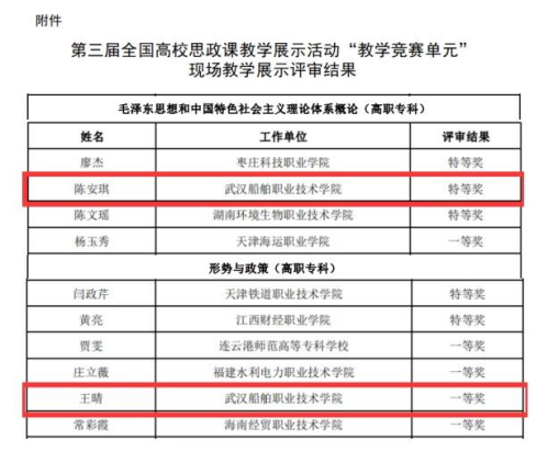 近日,教育部公布了第三届全国高校思想政治理论课教学展示活动评选结果。武汉船舶职业技术学院陈安琪老师荣获特等奖,王晴老师荣获一等奖,取得了本届思政课教学展示比赛全国高职高专院校最好成绩,同时实现了湖北省高职高专院校在该项大赛上特等奖“零”的突破。这是该校深入贯彻落实习近平总书记关于思政课建设的重要指示批示精神,打造素质优良的新时代思政课教师队伍,深化思政课改革创新的一大成果。