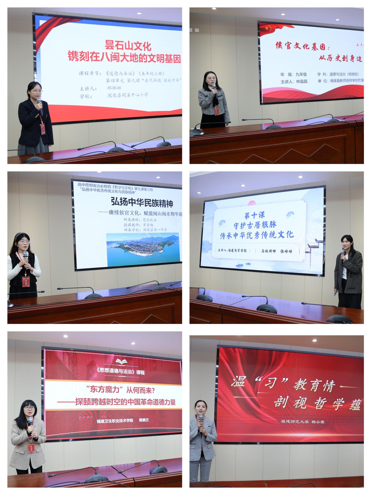 教学展示由我校马克思主义学院党总支书记、院长熊美兰主持。来自福建师范大学、福建卫生职业技术学院、福建商贸学校、闽侯县第一中学、闽侯县教师进修学校附属中学、闽侯县荆溪中心小学的6位教师循着“小学启蒙、中学深化、职教专精、大学引领”的育人路径依次登台,结合习近平与福建文化的情缘、侯官文化、昙石山文化等内容,用各具特色的教学设计诠释习近平文化思想与福建特色文化的融合路径。