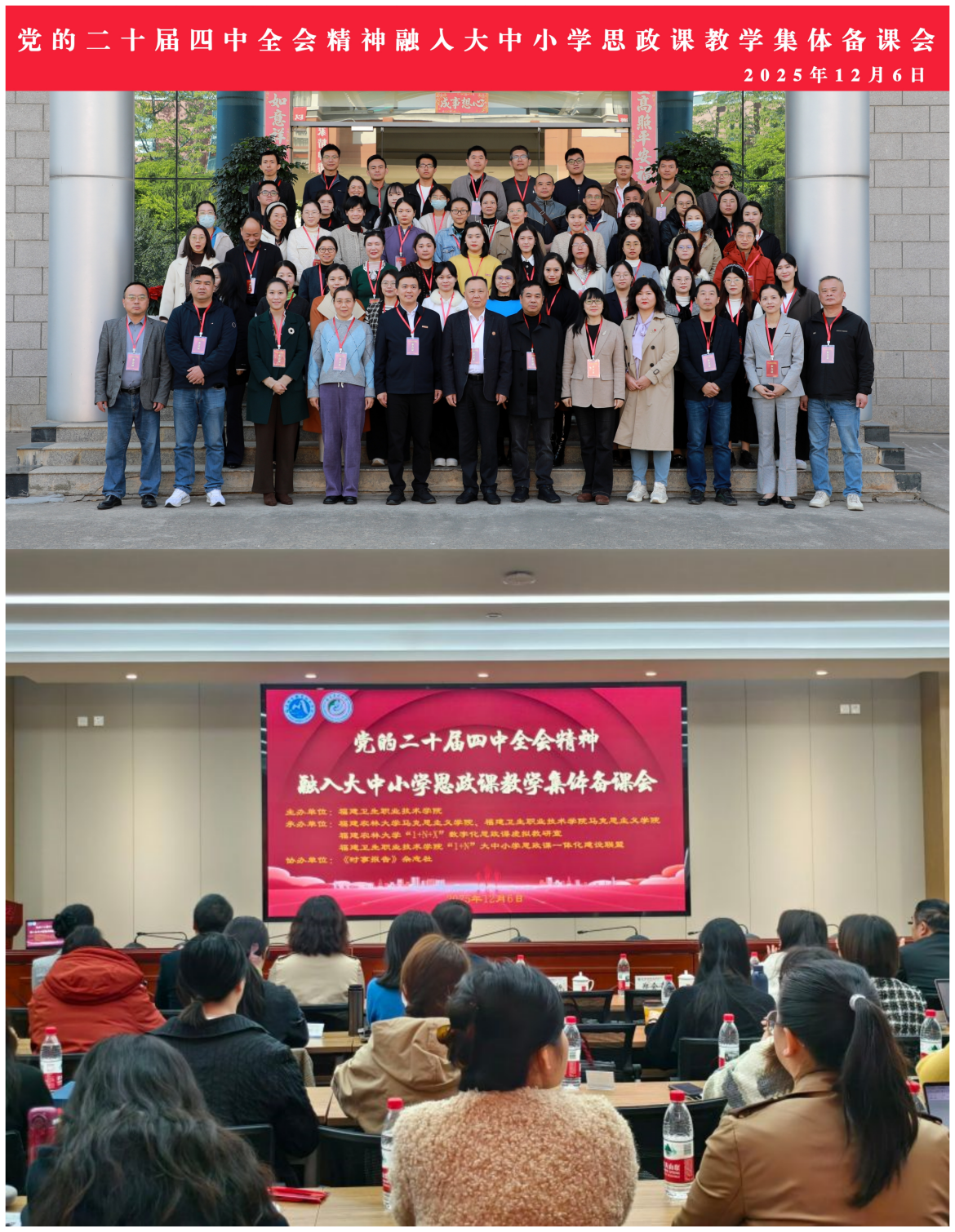 2025年12月6日,由福建卫生职业技术学院主办,福建卫生职业技术学院马克思主义学院与福建农林大学马克思主义学院联合承办的党的二十届四中全会精神融入大中小学思政课教学集体备课会在我校顺利召开。