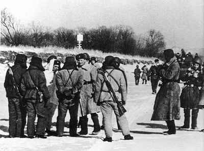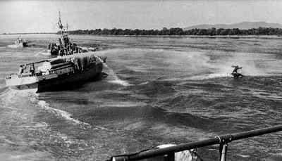苏军出动消防艇,用高压水龙喷射在乌苏里江上捕鱼的中国渔民