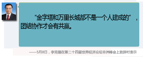 李克强总理此访是继去年习近平主席访非后中国主要领导人对非洲的又一次重要访问,也是中国新一届政府总理首次访非。此访正值新中国首任总理周恩来首次访非50周年,对进一步弘扬中非传统友谊、提升双方务实合作水平、深化中非新型战略伙伴关系、丰富和发展国际对非合作具有重要意义。访问期间,李克强总理在会谈、演讲等多种场合发表的观点,受到了舆论的高度关注和积极评价。现将其中的精彩语句摘录如下: